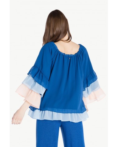 Chemisier en mousseline de soie volants multicolores avec encolure ronde, taille à cordon de serrage et sangle réglable, manches longues. Hauteur de modèle: 177 cm. La taille des portées: S/42.
